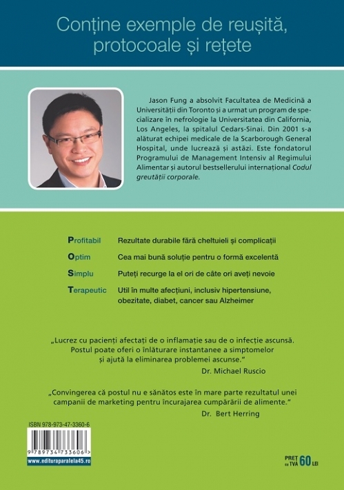 Comandă online cartea "Puterea vindecătoare a postului. Ghidul popular pentru post intermitent, alternativ sau extins" la 74,00 lei The Complete Guide to Fasting. Heal Your Body Through Intermittent, Alternate-Day, and Extended Fasting isbn 9789734733606 scrisă de Fung Jason, tiparită la editura Paralela 45. Cartea poate fi livrată în circa 2 zile cu plata ramburs sau online cu cardul.