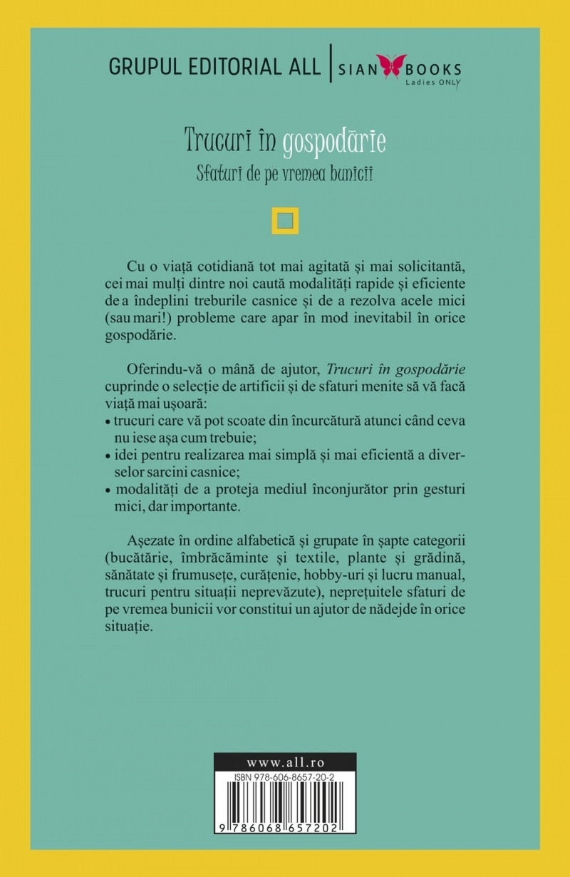În contextul vieții cotidiene agitate și solicitante, se întâmplă adesea ca treburile casnice să ne pună serios în încurcătură. Putem apela cu încredere la volumul Trucuri în gospodărie ca la o bunică sfătoasă, cu idei ingenioase. Nu numai că ne oferă o mână de ajutor binevenită, dar cuprinde o sumedenie de soluții rapide și eficiente pentru realizarea sarcinilor casnice. În plus, ne învață cum să evităm eventualele accidente din gospodărie și ne prezintă modalitățile prin care putem proteja mediul înconjurător. Rezultatul: ne vom bucura de o viață mult mai ușoară.
