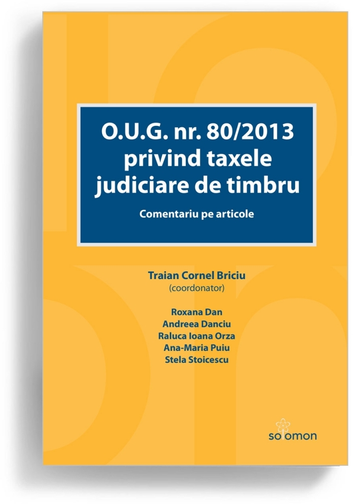Comandă online O.U.G. nr. 80/2013 privind taxele judiciare de timbru : comentariu pe articole la 145,31 lei isbn 9786068892658 scrisă de Traian Cornel Briciu , Ana-Maria Puiu , ... , Andreea Danciu , Roxana Dan , Raluca Ioana Orza , Stela Stoicescu, tiparită la editura Solomon în anul 2021. Cartea poate fi livrată în circa 20 zile cu plata ramburs sau online cu cardul.