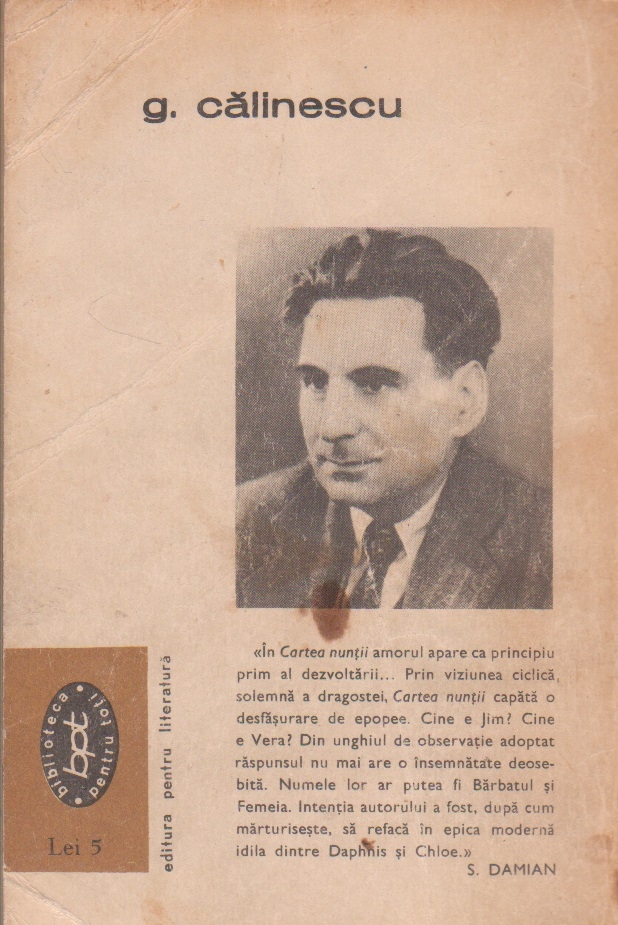 Comandă online Cartea nuntii la 10,50 lei scrisă de G. Calinescu, tiparită la editura Pentru Literatura face parte din colecția BPT serie noua în anul 1969. Livrare din stoc cu plata ramburs sau online cu cardul.