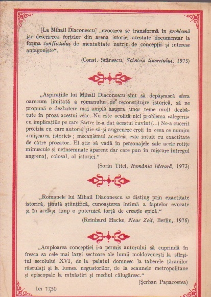 Amploarea conceptiei i-a permis autorului sa cuprinda in fresca sa cele mai largi sectoare ale lumii moldovenesti la sfarsitul secolului al XVI-lea, de la palatul domnesc la taberele taranilor rasculati si la lumea negustorilor, de la scaunele metropolitane si episcopale la manastiri si mediul calugaresc. - Serban Papacostea