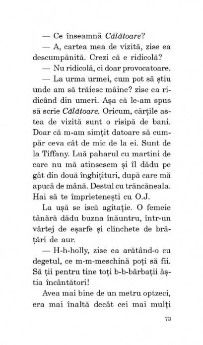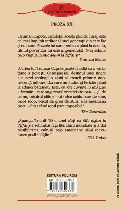 Traducere de Constantin Popescu Cartea a cunoscut o ecranizare celebra in 1961, cu Audrey Hepburn in rolul principal. Mic dejun la Tiffany este povestea unui scriitor care isi aminteste ca a cunoscut-o in urma cu cincisprezece ani, pe cind locuia intr-un vechi apartament din New York, pe Holly Golightly, o fata excentrica si misterioasa, care locuia in aceeasi cladire. In scurt timp, scriitorul aspirant de atunci si fata aceasta ciudata, pe a carei carte de vizita era scris „calatoare”, devin prieteni apropiati, iar opiniile si modul de viata neconventional, precum si lucrurile neobisnuite pe care le afla despre trecutul si aventurile prin care a trecut vecina sa ajung sa-l fascineze tot mai mult. Firul narativ simplu, liniar al microromanului ii permite lui Capote sa-si rafineze stilul caracteristic minimalist, intr-o forma vie si proaspata, care i-a adus un succes masiv la critica si public. „Truman Capote, omuletul acesta plin de curaj, este cel mai implinit scriitor al unei generatii din care fac si eu parte. Frazele lui sint perfecte pina la detaliu, ritmul povestilor lui este impenetrabil. N-as schimba o virgula in Mic dejun la Tiffany.” (Norman Mailer) „Cartea lui Truman Capote poate fi citita ca o variatiune a povestii Cenusaresei: destinul unei tinere ale carei aspiratii o ajuta sa treaca printr-o adolescenta tulbure, dar care nu-i aduc si fericire pina la adinci batrineti. Este, cu alte cuvinte, o imagine a formarii, care sugereaza oricarei cititoare – si, de ce nu, oricarui cititor – ca orice schimbare de sine, orice scop, oricit de greu de atins, e la indemina oricui, chiar cind totul pare imposibil.” (The Guardian) „Aparitia in anii ‘60 a unei carti ca Mic dejun la Tiffany a schimbat fata literaturii mondiale si a dat posibilitatea culturii pop americane sa-si reevalueze posibilitatile.” (USA Today) Carte recomandata de:
