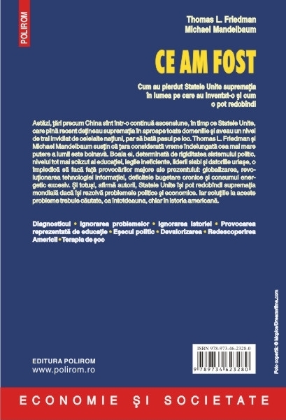 Traducere de Lucia Dos si Miruna Andriescu Astazi, tari precum China sint intr-o continua ascensiune, in timp ce Statele Unite, care pina recent detineau suprematia in aproape toate domeniile si aveau un nivel de trai invidiat de celelalte natiuni, par sa bata pasul pe loc. Thomas L. Friedman si Michael Mandelbaum sustin ca tara considerata vreme indelungata cea mai mare putere a lumii este bolnava. Boala ei, determinata de rigiditatea sistemului politic, nivelul tot mai scazut al educatiei, legile ineficiente, liderii slabi si datoriile uriase, o impiedica sa faca fata provocarilor majore ale prezentului: globalizarea, revolutionarea tehnologiei informatiei, deficitele bugetare cronice si consumul energetic excesiv. Si totusi, afirma autorii, Statele Unite isi pot redobindi suprematia mondiala daca isi rezolva problemele politice si economice. Iar solutiile la aceste probleme trebuie cautate, ca intotdeauna, chiar in istoria americana.