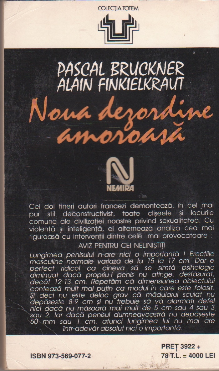 Comandă online cartea "Noua dezordine amoroasa" la 15,90 lei scrisă de Pascal Bruckner , Alain Finkielkraut Luminita Braileanu, tiparită la editura Nemira în anul 1995. cu plata ramburs sau online cu cardul. Momentan titlul "Noua dezordine amoroasa" nu este disponibil însa vă puteți înscrie pentru a fi notificat în momenul reaprovizionarii.