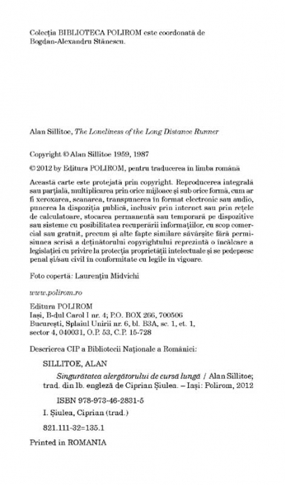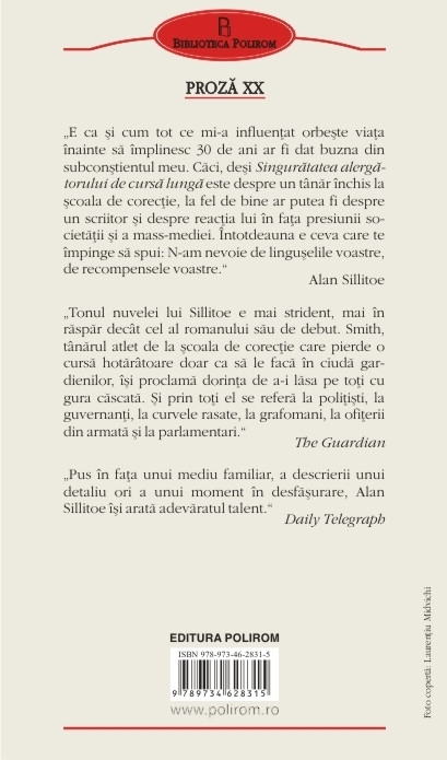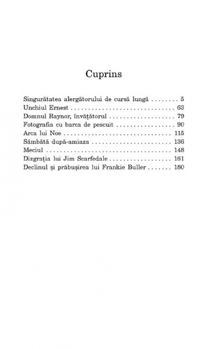 Traducere din limba engleza de Ciprian Siulea Nuvela Singuratatea alergatorului de cursa lunga (The Loneliness of the Long Distance Runner), detinatoare a premiului Hawthornden pentru literatura, a fost publicata in 1959 si ecranizata in 1962, dupa un scenariu scris de autor, in regia lui Tony Richardson. Filmul i‑a adus actorului Tom Courtenay (cunoscut publicului pentru rolurile de mai tirziu din filme precum Doctor Jivago sau Noaptea generalilor) un premiu Bafta pentru debut in 1963. Protagonistul, un tinar rebel, ajunge sa fie inchis, pentru o spargere, intr‑un centru de corectie unde i se ofera sansa sa ia parte la un concurs de cros pe distante lungi. Diminetile friguroase, chinuitoare si orele lungi de alergare il fac sa se gindeasca la lumea din jur, cu ipocrizia ei, lipsa de moralitate si telurile superficiale. Alaturi de aceasta nuvela, volumul contine alte citeva povestiri, printre care : Unchiul Ernest, Domnul Raynor, invatatorul, Fotografia cu barca de pescuit, Arca lui Noe, Simbata dupa‑amiaza, Declinul si prabusirea lui Frankie Buller. „E ca si cum tot ce mi-a influentat orbeste viata inainte sa implinesc 30 de ani ar fi dat buzna din subconstientul meu. Caci, desi Singuratatea alergatorului de cursa lunga este despre un tinar inchis la scoala de corectie, la fel de bine ar putea fi despre un scriitor si despre reactia lui in fata presiunii societatii si a mass-mediei. Intotdeauna e ceva care te impinge sa spui: N-am nevoie de linguselile voastre, de recompensele voastre.” (Alan Sillitoe) „Tonul nuvelei lui Sillitoe e mai strident, mai in raspar decit cel al romanului sau de debut. Smith, tinarul atlet de la scoala de corectie care pierde o cursa hotaritoare doar ca sa le faca in ciuda gar-dienilor, isi proclama dorinta de a-i lasa pe toti cu gura cascata. Si prin toti el se refera la politisti, la guvernanti, la curvele rasate, la grafomani, la ofiterii din armata si la parlamentari.” (The Guardian) „Pus in fata unui mediu familiar, a descrierii unui detaliu ori a unui moment in desfasurare, Alan Sillitoe isi arata adevaratul talent.” (Daily Telegraph) Carte recomandata de