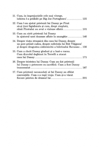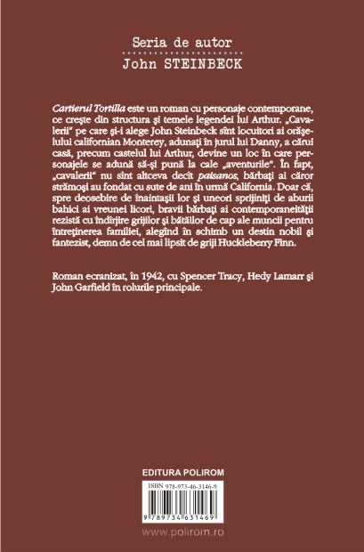 Traducere din limba engleza si note de Veronica Focseneanu John Steinbeck este laureat al Premiului Nobel pentru Literatura in anul 1962. Roman ecranizat, in 1942, cu Spencer Tracy, Hedy Lamarr si John Garfield in rolurile principale. Cartierul Tortilla este un roman cu personaje contemporane, ce creste din structura si temele legendei lui Arthur. „Cavalerii” pe care si-i alege John Steinbeck sint locuitori ai oraselului californian Monterey, adunati in jurul lui Danny, a carui casa, precum castelul lui Arthur, devine un loc in care personajele se aduna sa-si puna la cale „aventurile”. In fapt, „cavalerii” nu sint altceva decit paisanos, barbati ai caror stramosi au fondat cu sute de ani in urma California. Doar ca, spre deosebire de inaintasii lor si uneori sprijiniti de aburii bahici ai vreunei licori, bravii barbati ai contemporaneitatii rezista cu indirjire grijilor si batailor de cap ale muncii pentru intretinerea familiei, alegind in schimb un destin nobil si fantezist, demn de cel mai lipsit de griji Huckleberry Finn.