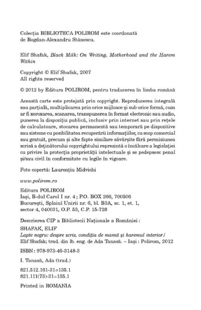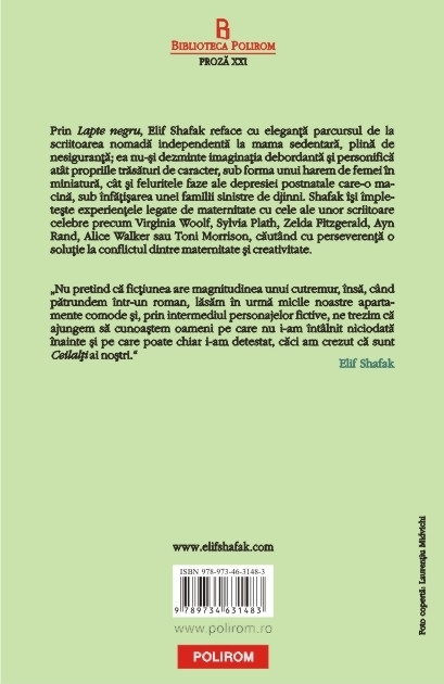 Traducere din limba engleza si note de Ada Tanasa Prin Lapte negru, Elif Shafak reface cu eleganta parcursul de la scriitoarea nomada independenta la mama sedentara, plina de nesiguranta; ea nu-si dezminte imaginatia debordanta si personifica atit propriile trasaturi de caracter, sub forma unui harem de femei in miniatura, cit si feluritele faze ale depresiei postnatale care-o macina, sub infatisarea unei familii sinistre de djinni. Shafak isi impleteste experientele legate de maternitate cu cele ale unor scriitoare celebre precum Virginia Woolf, Sylvia Plath, Zelda Fitzgerald, Ayn Rand, Alice Walker sau Toni Morrison, cautind cu perseverenta o solutie la conflictul dintre maternitate si creativitate. „Nu pretind ca fictiunea are magnitudinea unui cutremur, insa, cind patrundem intr-un roman, lasam in urma micile noastre apartamente comode si, prin intermediul personajelor fictive, ne trezim ca ajungem sa cunoastem oameni pe care nu i-am intilnit niciodata inainte si pe care poate chiar i-am detestat, caci am crezut ca sint Ceilalti ai nostri.” (Elif Shafak) Carte recomandata de