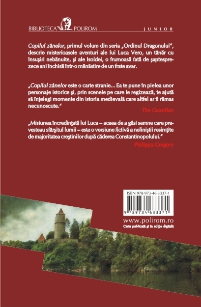 Traducere din limba engleza de Luminita Gavrila Copilul zinelor, primul volum din seria „Ordinul Dragonului”, descrie misterioasele aventuri ale lui Luca Vero, un tinar cu insusiri nebanuite, si ale Isoldei, o frumoasa fata de saptesprezece ani inchisa intr-o manastire de un frate avar. Ne aflam in Italia anului 1453 si toate semnele arata ca se apropie sfirsitul lumii. Invinuit de erezie si expulzat din manastirea sa, tinarul Luca Vero, in virsta de saptesprezece ani, este adus in rindurile sale de un ordin religios secret – Ordinul Dragonului – si trimis sa cerceteze raul ce s-a raspindit pe tot cuprinsul Europei. Isolda este o fata de saptesprezece ani, inchisa intr-o manastire de propriul ei frate, ca sa nu poata mosteni averea tatalui. Cind maicile de aici incep sa umble in somn si sa aiba viziuni ciudate, Isolda este acuzata de vrajitorie, iar Luca, trimis sa o cerceteze, o va ajuta in schimb sa scape. Nevoiti sa se confrunte cu cele mai mari temeri ale lumii medievale – magia neagra, vircolacii si nebunia – , Luca si Isolda pornesc in cautarea adevarului, a propriului lor destin si a dragostei, aventurindu-se intr-o calatorie in lumea necunoscuta, spre adevarata figura istorica ce apara granitele crestinatatii si cuprinde secretele Ordinului Dragonului. „Copilul zinelor este o carte stranie... Ea te pune in pielea unor personaje istorice si, prin scenele pe care le regizeaza, te ajuta sa intelegi momente din istoria medievala care altfel ar fi ramas necunoscute.” (The Guardian) „Misiunea incredintata lui Luca – aceea de a gasi semne care prevesteau sfirsitul lumii – este o versiune fictiva a nelinistii resimtite de majoritatea crestinilor dupa caderea Constantinopolului.” (Philippa Gregory)