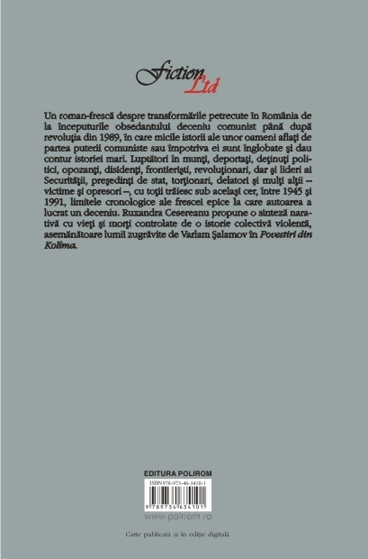 Un roman-fresca despre transformarile petrecute in Romania de la inceputurile obsedantului deceniu comunist pina dupa revolutia din 1989, in care micile istorii ale unor oameni aflati de partea puterii comuniste sau impotriva ei sint inglobate si dau contur istoriei mari. Luptatori in munti, deportati, detinuti politici, opozanti, disidenti, frontieristi, revolutionari, dar si lideri ai Securitatii, presedinti de stat, tortionari, delatori si multi altii – victime si opresori –, cu totii traiesc sub acelasi cer, intre 1945 si 1991, limitele cronologice ale frescei epice la care autoarea a lucrat un deceniu. Ruxandra Cesereanu propune o sinteza narativa cu vieti si morti controlate de o istorie colectiva violenta, asemanatoare lumii zugravite de Varlam Salamov in Povestiri din Kolima.