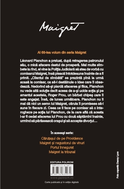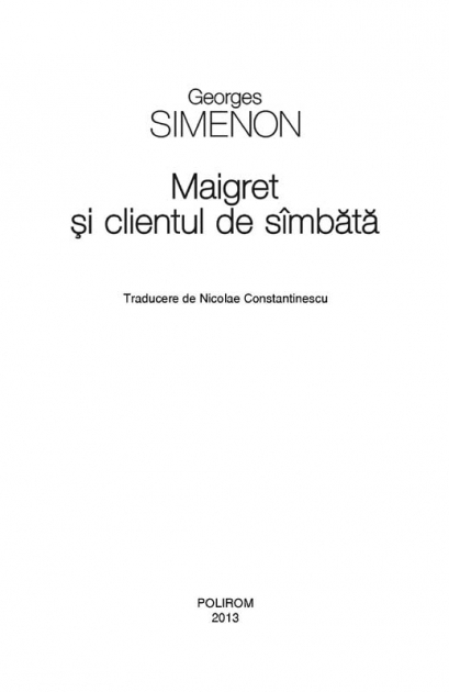 Traducere de Nicolae Constantinescu Al 68-lea volum din seria Maigret Leonard Planchon a preluat, dupa retragerea patronului sau, o mica afacere destul de prospera. Mai multe simbete la rind, el vine la Politia Judiciara sa stea de vorba cu comisarul Maigret, insa pleaca intotdeauna inainte de a fi primit. „Clientul de simbata” se prezinta pina la urma acasa la comisar, ca sa-i destainuie o idee care il obsedeaza. Nedorind sa-si piarda afacerea si fiica, Planchon nu vede alta solutie decit aceea de a-si ucide sotia si pe amantul acesteia, Roger Prou, un barbat chipes care ii este angajat. Insa, de lunea urmatoare, Planchon nu ii mai da nici un semn lui Maigret, caruia ii promisese sa-l sune in fiecare zi. Ceea ce il face pe comisar sa o interogheze pe sotia lui Planchon, de la care afla ca acesta i-ar fi cedat afacerea lui Prou cu doua saptamini inainte, urmind sa paraseasca orasul si sa accepte divortul…