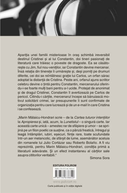 Marin Malaicu-Hondrari este autorul romanului Apropierea, in curs de ecranizare in regia lui Tudor Giurgiu. Un roman plin de tandrete si erotism, cu o structura absolut neconventionala, cu totul inedita, in care Marin Malaicu-Hondrari renunta la prudenta si se expune riscurilor, asa cum Lunetistul renunta la precautii, iese din ascunzatoare si incearca sa-si traiasca viata. Aparitia unei familii misterioase in oras schimba ireversibil destinul Cristinei si al lui Constantin, doi tineri pasionati de literatura care traiesc o poveste de dragoste. Ea se casatoreste cu Jim, fiul nou-venitilor, iar Constantin devine mercenar. Insa relatia din tinerete ii urmareste si, desi porniti pe drumuri diferite, cei doi se reintilnesc gratie lui Carlos, un orfan sarac adoptat la distanta de Cristina. Peste ani, orfanul ajuns scriitor celebru devine o tinta pentru Constantin, mercenarului oferindu-i-se foarte multi bani pentru a-l ucide. Protejat de anonimat si de dragul Cristinei, Constantin il avertizeaza pe Carlos de pericol. Citindu-i cartile, mercenarul incepe sa banuiasca motivul solicitarii crimei, iar presupunerile ii sint confirmate de organizatia pentru care lucreaza si de un e-mail in care Cristina i se confeseaza. „Marin Malaicu-Hondrari scrie – de la Cartea tuturor intentiilor la Apropierea si, iata, acum, la Lunetistul – o singura carte. Iar aceasta carte unica – amestec rar de sfisiere si umor – se sprijina pe un filon poetic ce sustine, ca o pinza freatica, intregul si leaga intimplari, iubiri, esecuri, fiinte rare, toate scufundate intr-un aer melancolic, de sfirsit de lume, asemanator aceluia din romanele lui Julio Cortázar sau Roberto Bolaño. A fi viu reprezinta, pentru Marin Malaicu-Hondrari, conditia prima a literaturii adevarate. Si un efect instantaneu al cartilor sale asupra cititorilor veritabili.” (Simona Sora)
