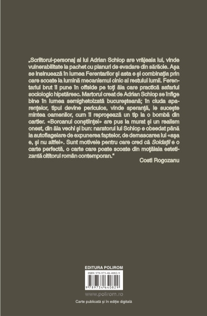 „Scriitorul-personaj al lui Adrian Schiop are vrajeala lui, vinde vulnerabilitate la pachet cu planuri de evadare din saracie. Asa se insinueaza in lumea Ferentarilor si asta e si combinatia prin care scoate la lumina mecanismul cinic al restului lumii. Ferentariul brut ii pune in offside pe toti aia care practica safariul sociologic hipstaresc. Martorul creat de Adrian Schiop se infige bine in lumea semighetoizata bucuresteana; in ciuda aparentelor, tipul devine periculos, vinde speranta, le suceste mintea oamenilor, cum ii reproseaza un tip la o bomba din cartier. «Borcanul constiintei» are pus la murat si un realism onest, din ala vechi si bun: naratorul lui Schiop e obsedat pina la autoflagelare de expunerea faptelor, de demascarea lui «asa e, si nu altfel». Sint motivele pentru care cred ca Soldatii e o carte perfecta, o carte care poate scoate din motaiala estetizanta cititorul roman contemporan.” (Costi Rogozanu)