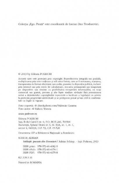 Comandă online cartea "Soldaţii. Poveste din Ferentari" la 28,50 lei isbn 9789734640829 scrisă de Adrian Schiop, tiparită la editura Polirom face parte din colecția Ego. Proza. cu plata ramburs sau online cu cardul. Momentan titlul "Soldaţii. Poveste din Ferentari" nu este disponibil însa vă puteți înscrie pentru a fi notificat în momenul reaprovizionarii.