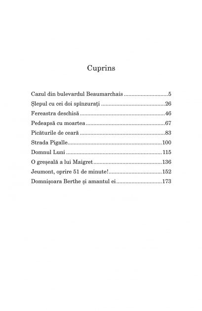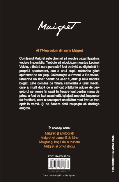 Traducere de Nicolae Constantinescu Al 77-lea volum din seria Maigret Comisarul Maigret este chemat sa rezolve cazuri la prima vedere imposibile. Trebuie sa elucideze moartea Louisei Voivin, o tinara care pare sa fi fost otravita cu digitalina in propriul apartament, sau a unui cuplu misterios gasit spinzurat pe un slep. Calatoreste cu trenul la Bruxelles, urmarind un tinar banuit ca si-ar fi jefuit si ucis unchiul bogat. Este convins ca tinara camerista a unui medic, care a murit dupa ce a mincat prajiturile aduse de cersetorul ce venea in casa in fiecare luni pentru masa de prinz, a fost de fapt asasinata. Isi ajuta nepotul, inspector de frontiera, care a descoperit un calator mort intr-un tren oprit in vama. Si de fiecare data reuseste sa dezlege enigma. In aceeasi serie: Maigret si aristocratii Maigret si oamenii de bine Maigret si hotul de buzunare Maigret si omul singur