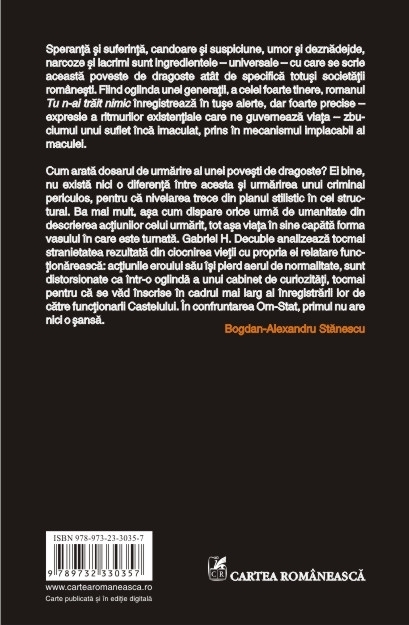 Speranta si suferinta, candoare si suspiciune, umor si deznadejde, narcoze si lacrimi sint ingredientele – universale – cu care se scrie aceasta poveste de dragoste atit de specifica totusi societatii romanesti. Fiind oglinda unei generatii, a celei foarte tinere, romanul Tu n-ai trait nimic inregistreaza in tuse alerte, dar foarte precise – expresie a ritmurilor existentiale care ne guverneaza viata – zbuciumul unui suflet inca imaculat, prins in mecanismul implacabil al maculei.