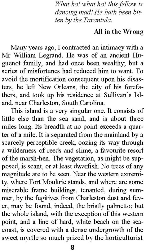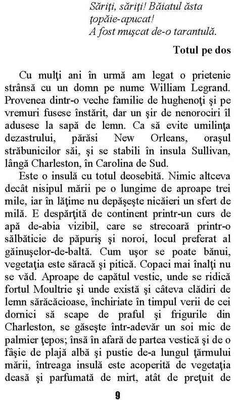 Edgar Allan Poe, autorul celebrului Corb, ne arata in Carabusul de aur de ce este adesea considerat a fi parintele prozei scurte moderne. O povestire plina de farmec si de mister, care poate fi citita fie ca o pasionanta cautare de comori si dezlegare de ghicitori pirateresti, fie – de catre adulti sau specialisti – ca o deconspirare a modului in care se scrie un text literar. Oricare ar fi insa grila de lectura la care am face referire, umorul si ironia raman prezente si insotesc in permanenta aventura, asigurand savoarea lecturii.