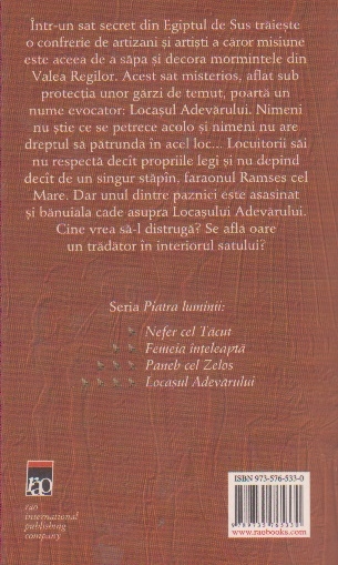 Intr-un sat secret din Egiptul de Sus traieste o confrerie de artizani si artisti a caror misiune este aceea de a sapa si decora mormintele din Valea Regilor. Acest sat misterios, aflat sub protectia unor garzi de temut, poarta un nume evocator: Locasul Adevarului. Nimeni nu stie ce se petrece acolo si nimeni nu are dreptul sa patrunda in acel loc... Locuitorii sai nu respecta decit propriile legi si nu depind decit de un singur stapin, faraonul Ramses cel Mare. Dar unul dintre paznici este asasinat si banuiala cade asupra Locasului Adevarului. Cine vrea sa-l distruga? Se afla oare un tradator in interiorul satului?