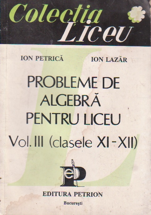 Comandă online Probleme de algebra pentru liceu Vol. III (clasele XI-XII) la 10,50 lei scrisă de Ion Petrica, tiparită la editura Petrion face parte din colecția LICEU în anul 1995. cu plata ramburs sau online cu cardul. Momentan titlul Probleme de algebra pentru liceu Vol. III (clasele XI-XII) nu este disponibil însa vă puteți înscrie pentru a fi notificat în momenul reaprovizionarii.