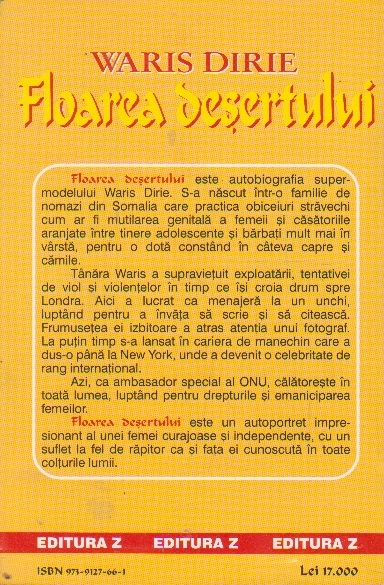 Comandă online cartea "Floarea desertului" la 13,60 lei scrisă de Waris Dirie, tiparită la editura Z2000 în anul 1999 cu un număr de 238 pagini. cu plata ramburs sau online cu cardul. Momentan titlul "Floarea desertului" nu este disponibil însa vă puteți înscrie pentru a fi notificat în momenul reaprovizionarii.