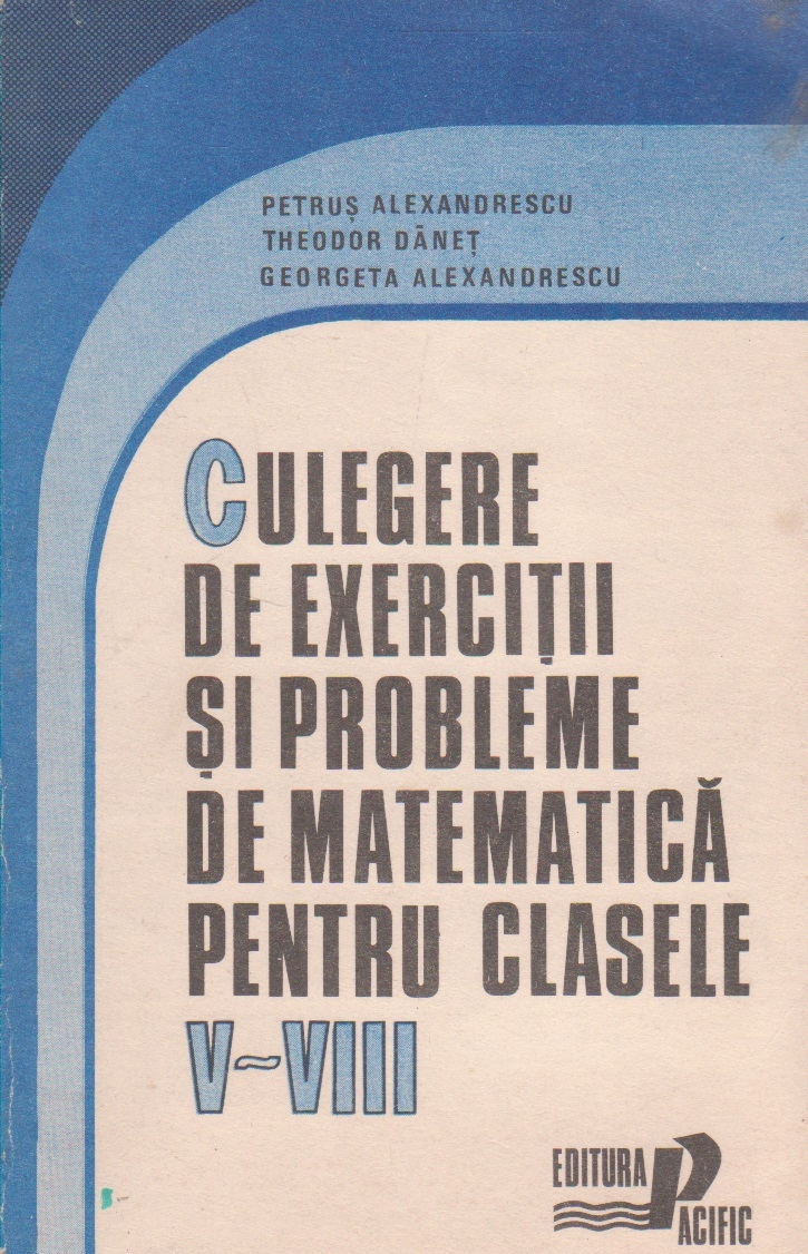 Comandă online cartea "Culegere de exercitii si probleme de matematica pentru clasele V-VIII" la 13,60 lei scrisă de Petrus Alexandrescu, tiparită la editura Pacific cu un număr de 236 pagini categorie Culegeri de probleme, Matematica, Manuale scolare, Învățamânt - Educație. cu plata ramburs sau online cu cardul. Momentan titlul "Culegere de exercitii si probleme de matematica pentru clasele V-VIII" nu este disponibil însa vă puteți înscrie pentru a fi notificat în momenul reaprovizionarii.