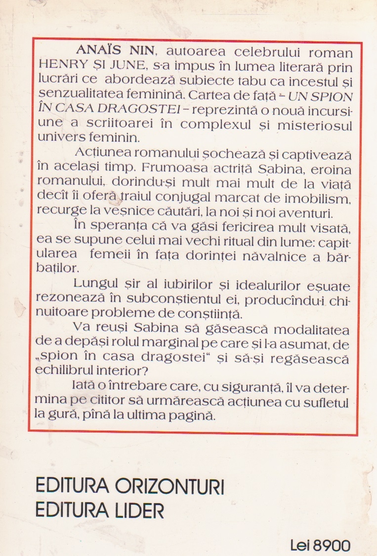 Comandă online cartea "Un spion in casa dragostei. Triunghiul Venerei" la 15,90 lei scrisă de Anais Nin, tiparită la editura Orizonturi face parte din colecția Bestseller-urile ultimului deceniu în anul 1982. cu plata ramburs sau online cu cardul. Momentan titlul "Un spion in casa dragostei. Triunghiul Venerei" nu este disponibil însa vă puteți înscrie pentru a fi notificat în momenul reaprovizionarii.