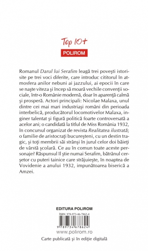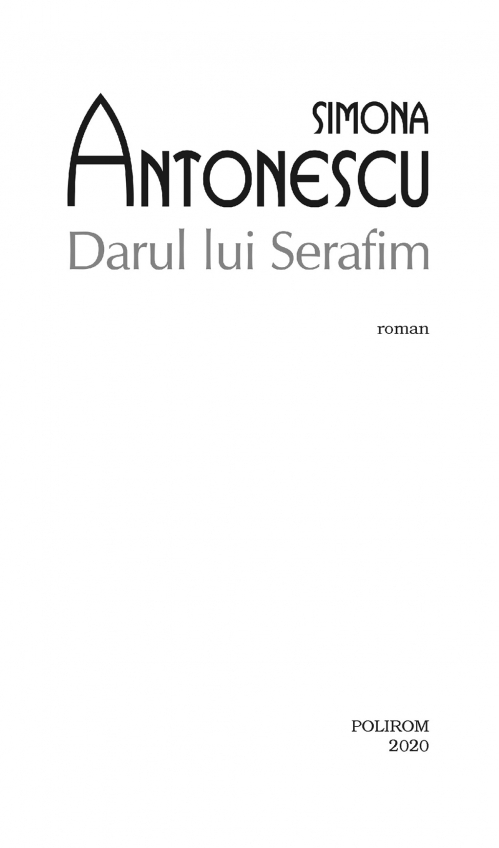 Romanul Darul lui Serafim leagă trei poveşti istorisite pe trei voci diferite, care introduc cititorul în atmosfera anilor nebuni ai jazzului, ai epocii în care se naşte viteza şi încep să moară vechile convenţii sociale, într-o Românie modernă, doar în aparenţă calmă şi prosperă. Actori principali: Nicolae Malaxa, unul dintre cei mai mari industriaşi români din perioada interbelică, producătorul locomotivelor Malaxa, inginer talentat şi figură politică foarte controversată a acelor ani; o candidată la titlul de Miss România 1932, în concursul organizat de revista Realitatea ilustrată; o familie de aristocraţi bucureşteni, cu un destin tragic, şi toţi membrii săi strînşi în jurul celor doi băieţi de vîrstă şcolară. Ce au în comun toate aceste personaje? Răspunsul îl ştie numai Serafim, bătrînul cerşetor cu puteri tainice care străjuieşte, în noaptea de Vovidenie a anului 1932, impunătoarea biserică a Amzei.