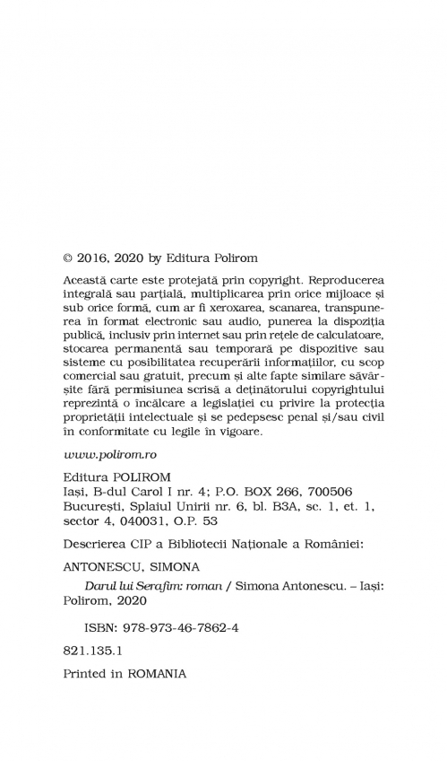 Comandă online cartea "Darul lui Serafim (ediție de buzunar)" la 29,04 lei isbn 9789734678624 scrisă de Simona Antonescu, tiparită la editura Polirom face parte din colecția Top 10+. cu plata ramburs sau online cu cardul. Momentan titlul "Darul lui Serafim (ediție de buzunar)" nu este disponibil însa vă puteți înscrie pentru a fi notificat în momenul reaprovizionarii.