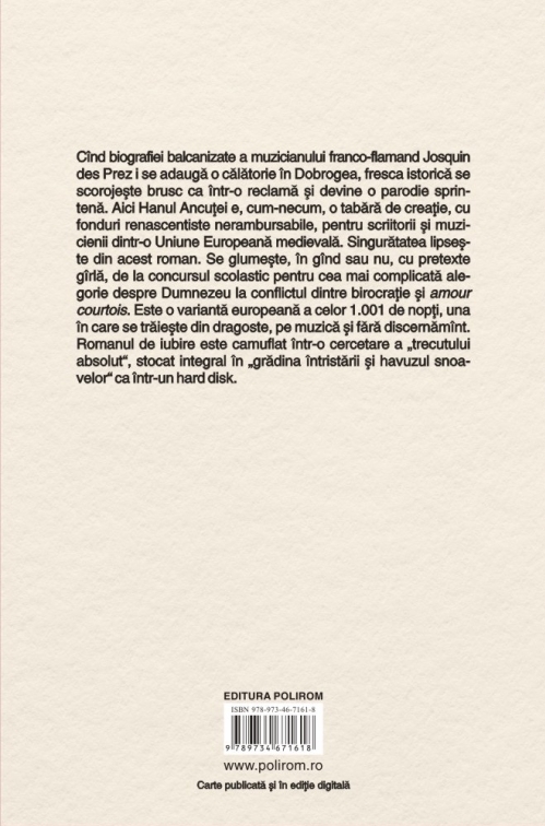 Cînd biografiei balcanizate a muzicianului franco-flamand Josquin des Prez i se adaugă o călătorie în Dobrogea, fresca istorică se scorojeşte brusc ca într-o reclamă şi devine o parodie sprintenă. Aici Hanul Ancuţei e, cum-necum, o tabără de creaţie, cu fonduri renascentiste nerambursabile, pentru scriitorii şi muzicienii dintr-o Uniune Europeană medievală. Singurătatea lipseşte din acest roman. Se glumeşte, în gînd sau nu, cu pretexte gîrlă, de la concursul scolastic pentru cea mai complicată alegorie despre Dumnezeu la conflictul dintre birocraţie şi amour courtois. Este o variantă europeană a celor 1.001 de nopţi, una în care se trăieşte din dragoste, pe muzică şi fără discernămînt. Romanul de iubire este camuflat într-o cercetare a „trecutului absolut”, stocat integral în „grădina întristării şi havuzul snoavelor” ca într-un hard disk.