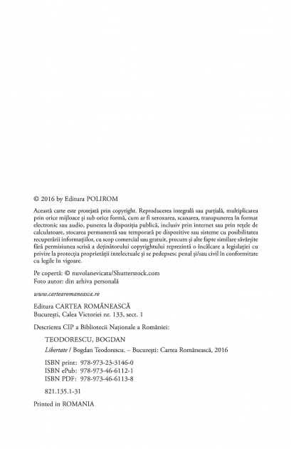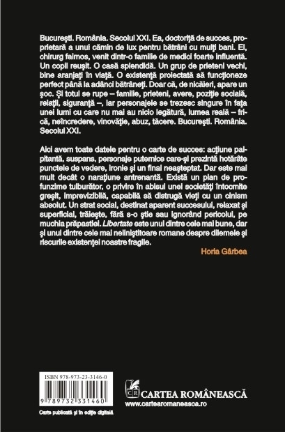 Bucuresti. Romania. Secolul XXI. Ea, doctorita de succes, proprietara a unui camin de lux pentru batrini cu multi bani. El, chirurg faimos, venit dintr-o familie de medici foarte influenta. Un copil reusit. O casa splendida. Un grup de prieteni vechi, bine aranjati in viata. O existenta proiectata sa functioneze perfect pina la adinci batrineti. Doar ca, de nicaieri, apare un soc. Si totul se rupe – familie, prieteni, avere, pozitie sociala, relatii, siguranta –, iar personajele se trezesc singure in fata unei lumi cu care nu mai au nicio legatura, lumea reala – frica, neincredere, vinovatie, abuz, tacere. Bucuresti. Romania. Secolul XXI. „Aici avem toate datele pentru o carte de succes: actiune palpitanta, suspans, personaje puternice care-si prezinta hotarite punctele de vedere, ironie si un final neasteptat. Dar este mai mult decit o naratiune antrenanta. Exista un plan de profunzime tulburator, o privire in abisul unei societati intocmite gresit, imprevizibila, capabila sa distruga vieti cu un cinism absolut. Un strat social, destinat aparent succesului, relaxat si superficial, traieste, fara s-o stie sau ignorind pericolul, pe muchia prapastiei. Libertate este unul dintre cele mai bune, dar si unul dintre cele mai nelinistitoare romane despre dilemele si riscurile existentei noastre fragile.” (Horia Garbea) „Am fost intotdeauna interesat de felul in care se comporta individul pus fata in fata cu ceilalti, cei pe care ii cunoaste sau cei pe care nu-i cunoaste, dar este judecat de ei; cum se comporta individul acuzat de comunitatea sa ori de societate, fie ca se considera sau nu vinovat; cum se comporta individul adus in situatia de a se lupta cu forte mult superioare lui nu pentru un tel impresionant, ci doar pentru propria lui supravietuire si pentru reintoarcerea la normalitatea pierduta – reintoarcerea la viata din interiorul iluziei.” (Bogdan Teodorescu)