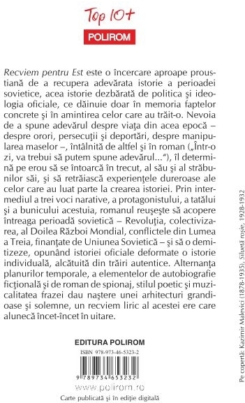 Traducere din limba franceza de Ileana Cantuniari Recviem pentru Est este o incercare aproape proustiana de a recupera adevarata istorie a perioadei sovietice, acea istorie dezbarata de politica si ideologia oficiale, ce dainuie doar in memoria faptelor concrete si in amintirea celor care au trait-o. Nevoia de a spune adevarul despre viata din acea epoca – despre orori, persecutii si deportari, despre manipularea maselor –, intilnita de altfel si in roman („Intr-o zi, va trebui sa putem spune adevarul...”), il determina pe erou sa se intoarca in trecut, al sau si al strabunilor sai, si sa retraiasca experientele dureroase ale celor care au luat parte la crearea istoriei. Prin intermediul a trei voci narative, a protagonistului, a tatalui si a bunicului acestuia, romanul reuseste sa acopere intreaga perioada sovietica – Revolutia, colectivizarea, al Doilea Razboi Mondial, conflictele din Lumea a Treia, finantate de Uniunea Sovietica – si sa o demitizeze, opunind istoriei oficiale deformate o istorie individuala, alcatuita din trairi autentice. Alternanta planurilor temporale, a elementelor de autobiografie fictionala si de roman de spionaj, stilul poetic si muzicalitatea frazei dau nastere unei arhitecturi grandioase si solemne, un recviem liric al acestei ere care aluneca incet-incet in uitare.