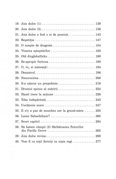 In Monterey, pe coasta Californiei, joia dulce urmeaza dupa o zi rea, dupa o zi plina de naduf, in care totul merge de‑a‑ndoaselea. Prin Joia dulce, John Steinbeck isi reaminteste de scenele din Strada Sardinelor – locurile sordide, gramezile de gunoaie si hotelurile mizere din Monterey, dar si personajele sale: Doc, acum maturizat dupa ce s‑a intors din razboi, Fauna, misterioasa matroana a bordelului de prin partea locului, Hazel, o puslama menita sa ajunga presedinte al Americii, sau Suzy, de curind ridicata la rangul de vedeta a prostitutiei. Mica sleahta ce alcatuieste comunitatea locala pune la cale un bal mascat menit sa‑i schimbe viata lui Doc: sa‑l insoare. Sfirsitul petrecerii, reluarea vietii obisnuite, dragostea lui Suzy pentru Doc, iubirea lui Doc pentru Suzy, micile iesiri in decor ale cite unui personaj sint culoarea stridenta ce se pierde intr‑un fundal framintat, greu de schimbat de veselia unui bal mascat.