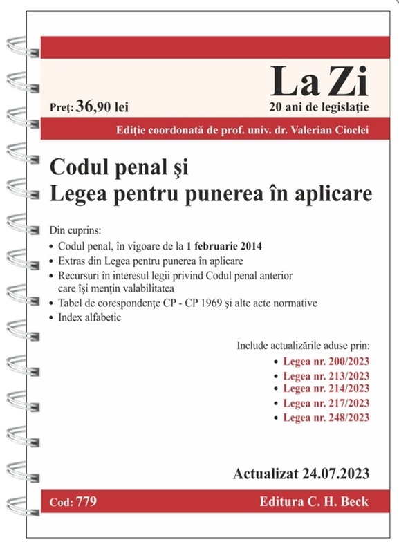 Comandă online cartea "Codul penal şi Legea pentru punerea în aplicare : actualizat iulie 2023" la 42,90 lei isbn 9786061813438 scrisă de Valerian Cioclei , ed. coord. de prof. univ. dr. Valerian Cioclei, tiparită la editura CH Beck în anul 2023. cu plata ramburs sau online cu cardul. Momentan titlul "Codul penal şi Legea pentru punerea în aplicare : actualizat iulie 2023" nu este disponibil însa vă puteți înscrie pentru a fi notificat în momenul reaprovizionarii.