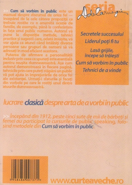 Nu-i asa ca emotiile dinaintea unui examen, a unui interviu sau a unei intalniri importante se transforma de cele mai multe ori in teama? Cum sa vorbim in public este un manual despre discursul de orice fel - incepand de la cele cateva propozitii ce trebuie rostite cu o anumita ocazie de familie, de exemplu, pana la conferintele in fata unui public numeros. Autorul va pune la dispozitie metode, tehnici practice si sugestii care, odata insusite, va vor ajuta ca atunci cand intalniti diverse persoane sau grupuri de oameni sa va adresati in mod eficient acestora. Puterea de afirmare a personalitatii inclusiv prin ceea ce spuneti este esentiala pentru reusita dumneavoastra. Asa cum autorul demonstreaza in fiecare pagina, tehnicile prin care puteti stapani un public va pot ajuta in imprejurarile de orice fel ale existentei. Urmati-i sfaturile si faceti din vorbele pe care le rostiti unul dintre atuurile dumneavoastra.Cum sa vorbim in public cuprinde douasprezece capitole: Dezvoltarea curajului si a increderii in sine, Formarea increderii in sine, Cum isi pregateau cuvantarile oratorii celebri, Imbunatatirea memoriei, Elementele de baza ale discursului eficient, Secretul unei exprimari reusite, Prezenta si personalitatea oratorului, Cum sa incepi un discurs, Cum sa inchei un discurs, Cum sa-ti exprimi clar punctul de vedere, Cum sa starnesti interesul publicului, Imbunatatirea stilului. Conditii si reguli de urmat pentru dezvoltarea curajului si a increderii in sine: 1. Sa incepeti cu o dorinta puternica si indIrjita. Treziti-va entuziasmul pentru ceea ce faceti. GInditi-va ce ar insemna pe plan social acest lucru; la prietenii pe care vi-i veti face prin influenta de care veti da dovada, prin spiritul de leader pe care vi-l va trezi. Veti ajunge in vIrf mult mai repede decIt prin orice alta activitate.2. Trebuie sa stiti exact despre ce vreti sa vorbiti.In autobiografia sa, Teddy Roosevelt scria: Am fost ales in toamna lui 1881 si am descoperit ca eram cel mai tInar dintre toti. Ca toti tinerii lipsiti de experienta, aveam probleme serioase cu invatatul vorbitului in public. Am profitat mult de pe urma sfatului unui taran iscusit. (...) Sfatul suna cam asa: Nu vorbi decIt atunci cInd esti sigur ca ai ceva de spus si ca stii exact despre ce e vorba. Numai atunci spune ce ai de spus si stai jos. 3. Aveti incredere in voi. Unul din cei mai celebri psihologi ai Americii, William James, scria urmatoarele: In drumul suveran pe care pornim de bunavoie, cel al entuziasmului, atunci cInd entuziasmul spontan ne paraseste trebuie sa-l retrezim, sa actionam si sa vorbim ca si cum el ar continua sa existe. Deci, pentru a capata curaj, purtati-va ca si cum ati fi deja curajos, cu o vointa de fier, si cu siguranta curajul va inlocui teama.4. Exersati! Exersati! Exersati! Acest sfat este de departe cel mai important. Aceasta este conditia sine qua non - fara de care nu se poate. Vreti sa scapati de teama de public? Sa incepem prin a afla ce anume o produce. Frica izvoraste din necunoastere si nesiguranta, afirma profesorul Robinson in cartea sa The Mind in the Making (Rolul mintii in realizarea actiunii) sau, altfel spus, este rezultatul unei lipse de incredere, iar lipsa de incredere este rezultatul faptului ca nu va cunoasteti adevaratele capacitati. Deci,cu cIt aveti mai multe experiente reusite, cu atIt temerile vor disparea mai repede. Dale Carnegie (pe numele lui real Dale Carnegey) s-a nascut la 24 noiembrie 1888 la o ferma saraca din Missouri si s-a stins din viata la 1 noiembrie 1955, la Forest Hills, New York, in plina glorie. Este unul dintre deschizatorii de drum in domeniul artei vorbirii in public si cel mai mare autor de literatura motivationala. Pe Dale Carnegie il regasim in topul celor mai bine vInduti autori din toate timpurile. La aproape jumatate de veac de la moartea lui, atIt scrierile, cIt si cursurile sale sunt la fel de solicitate ca si in primii ani dupa lansare. Eforturile lui Dale Carnegie de raspIndire a unor metode prin care oamenii sa invete sa-si optimizeze relatiile cu semenii si cu lumea au fost preluate de Fundatia Carnegie.
