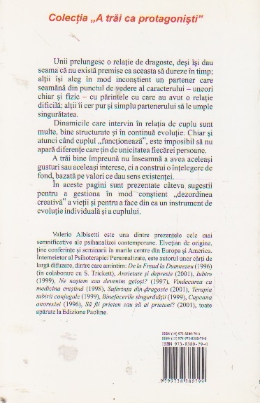 Comandă online cartea "Sa traim bine impreuna. Despre dinamica vietii in doi" la 10,50 lei scrisă de V Albisetti, tiparită la editura Pauline în anul 2006 cu un număr de 159 pagini. cu plata ramburs sau online cu cardul. Momentan titlul "Sa traim bine impreuna. Despre dinamica vietii in doi" nu este disponibil însa vă puteți înscrie pentru a fi notificat în momenul reaprovizionarii.