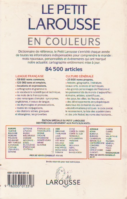 Dictionnaire de reference, le Petit Larousse s enrichit chaque annee de toutes les informations indispensables pour comprendre le monde: mots nouveaux, personnalites et evenements qui marque notre actualite, cartographie entierement mise a jour.